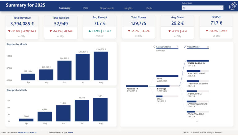 By choosing the full HBIS package — Hotel BI, Payroll BI, F&B BI, and ERP BI — we’ve unified reporting across all departments. Hours of manual effort have been eliminated through automation, saving valuable time for every team. Now, we have a clear, real-time picture of what’s happening across the entire business, enabling smarter and faster decisions.